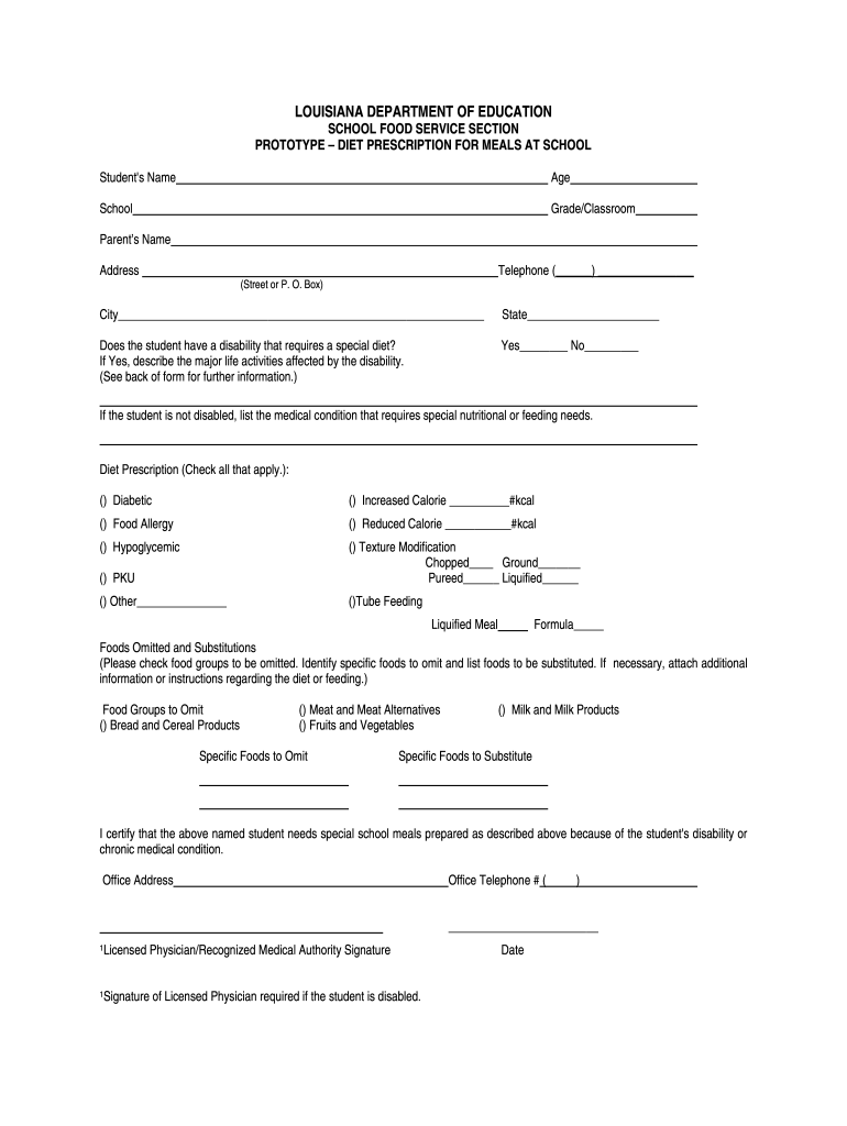LOUISIANA DEPARTMENT OF EDUCATIONSCHOOL FOOD SERVICE SECTION PROTOTYPE DIET PRESCRIPTION FOR MEALS AT SCHOOL Student's NameAgeSchoolGrade/ClassroomParents Name AddressTelephone () (Street or P. O.