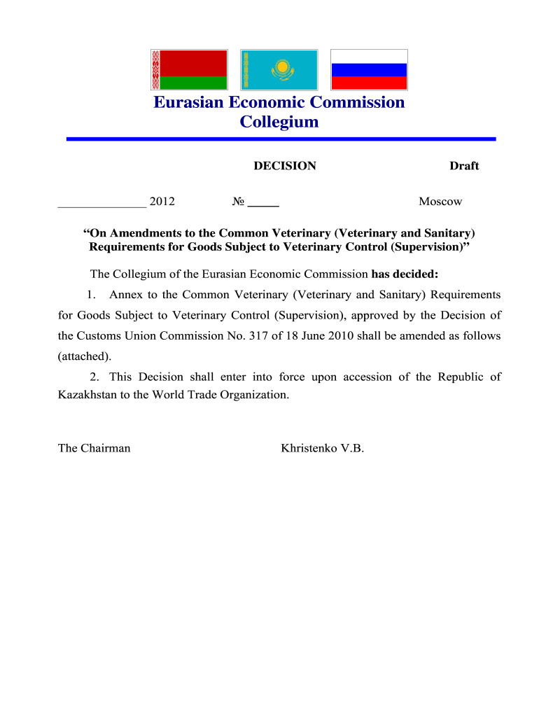 Eurasian Economic Commission Collegium DECISION 2012 Draft Moscow Amendments to the Common Veterinary (Veterinary and Sanitary) Requirements for Goods Subject to Veterinary Control (Supervision) The