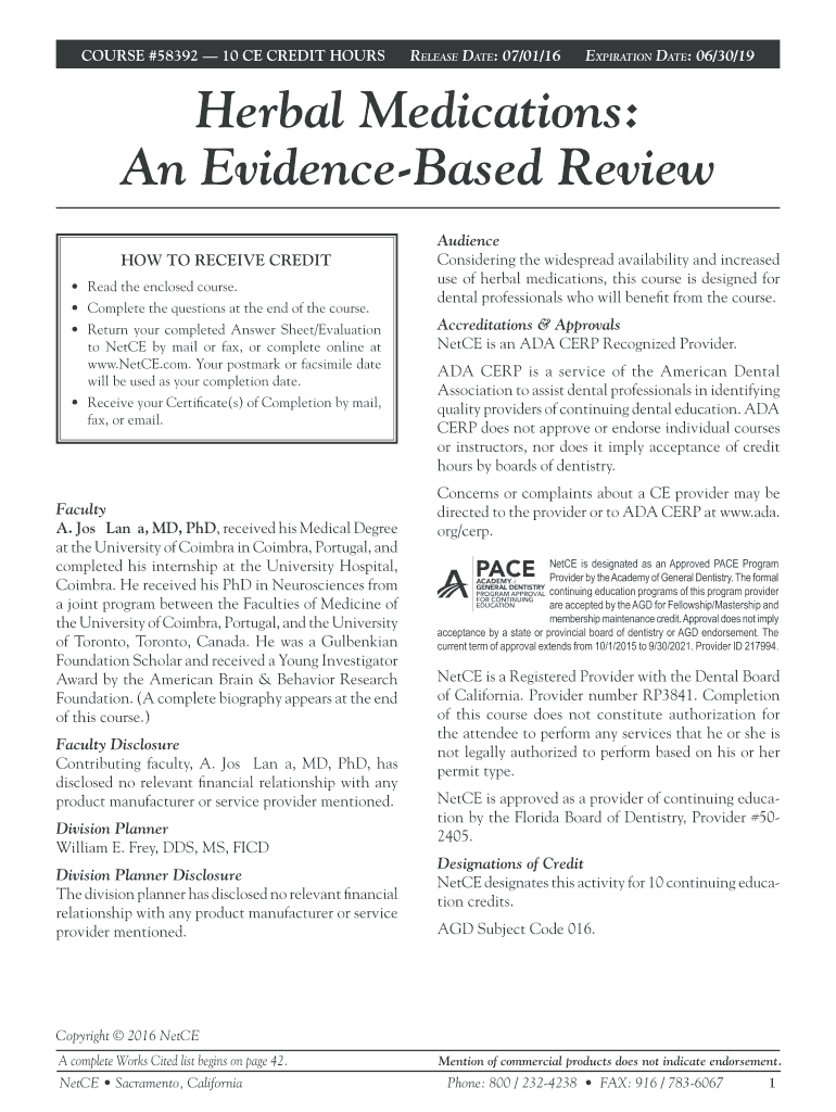 #58392 Herbal Medications: An EvidenceBased Review COURSE #58392 10 CE CREDIT HOURS Release Date: 07/01/16 Expiration Date: 06/30/19Herbal Medications: An EvidenceBased Review HOW TO RECEIVE CREDIT