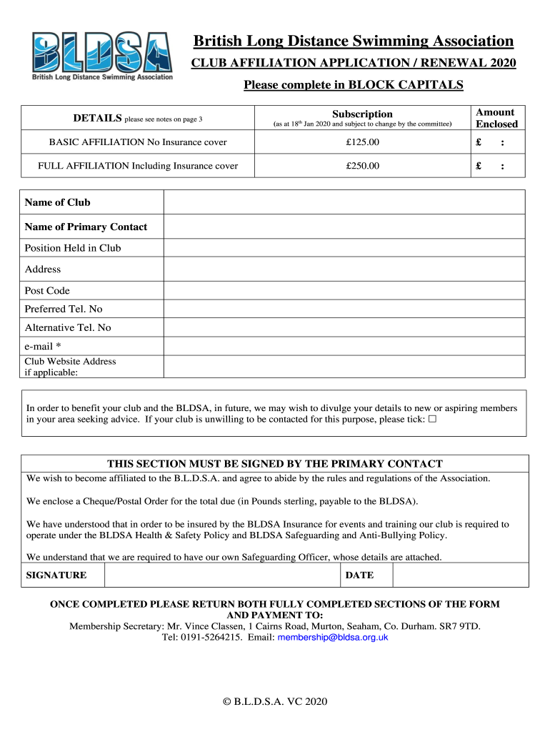 CLUB AFFILIATION APPLICATION / RENEWAL 2020