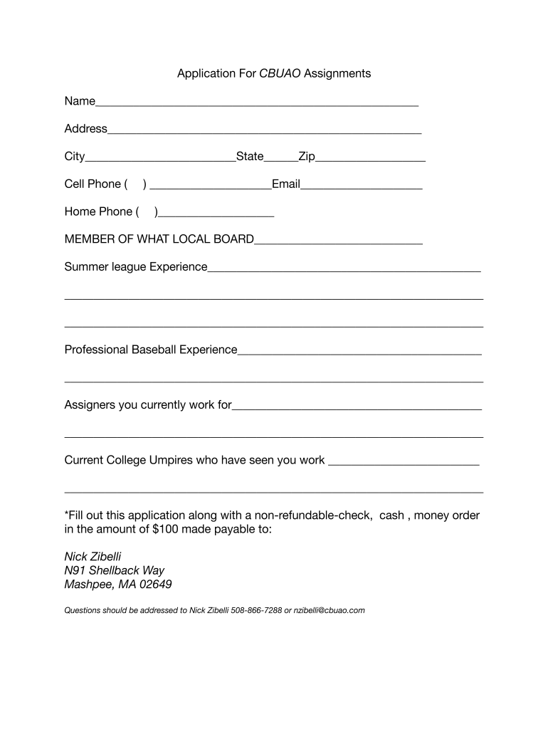 Application For CBU AO AssignmentsName Address City State Zip Cell Phone (Home Phone () Email) MEMBER OF WHAT LOCAL BOARD Summer league Experience Professional Baseball Experience Assigners you currently
