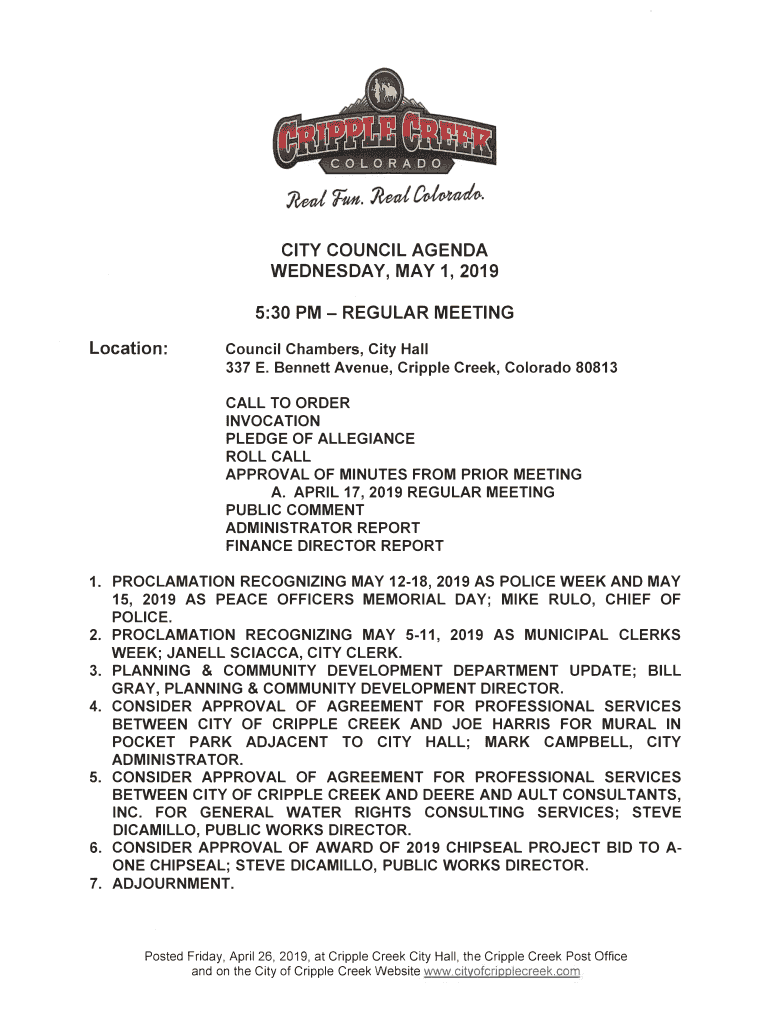 CITY COUNCIL AGENDA WEDNESDAY, MAY 1, 2019 5:30 PM REGULAR MEETING Location:Council Chambers, City Hall 337 E. Bennett Avenue, Cripple Creek, Colorado 80813 CALL TO ORDER INVOCATION PLEDGE OF ALLEGIANCE