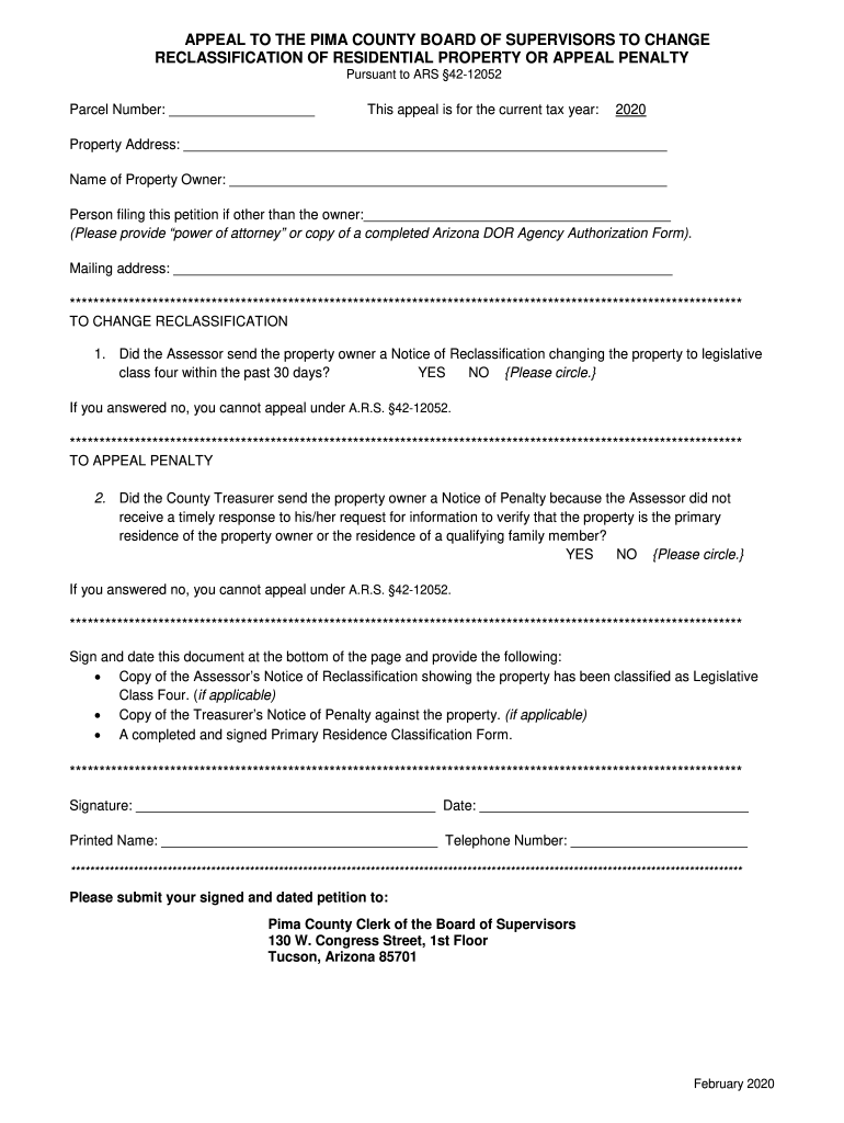 APPEAL TO THE PIMA COUNTY BOARD OF SUPERVISORS TO CHANGE RECLASSIFICATION OF RESIDENTIAL PROPERTY OR APPEAL PENALTY Pursuant to AS 4212052Parcel Number: This appeal is for the current tax year:2020Property