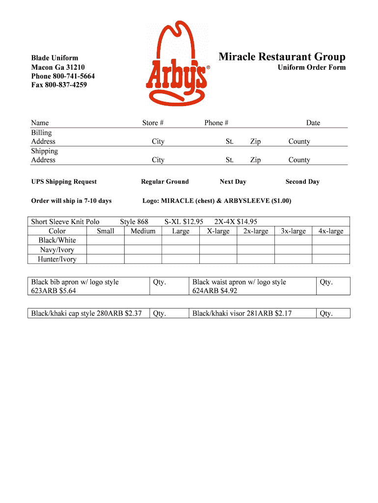 The Uniform Order Form is a purchase order template used by Miracle Restaurant Group to efficiently order uniforms for their stores.