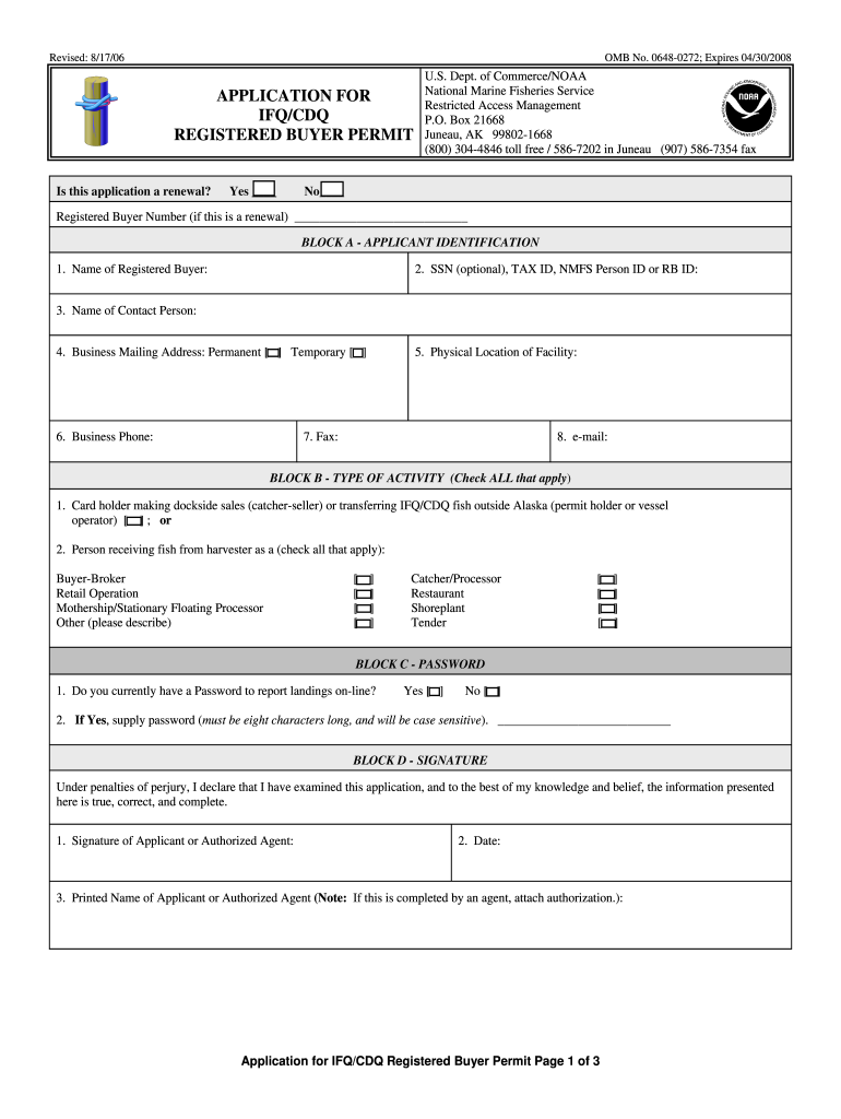 Revised: 8/17/06OMB No. 06480272; Expires 04/30/2008APPLICATION FOR IF/CD REGISTERED BUYER Permits this application a renewal? Yes U.S. Dept. of Commerce/NOAA National Marine Fisheries Service Restricted