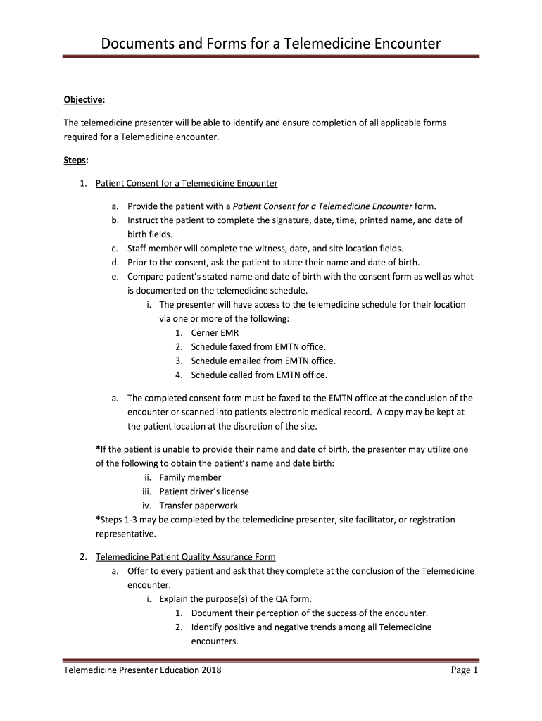 The telemedicine presenter will be able to identify and ensure completion of all applicable forms