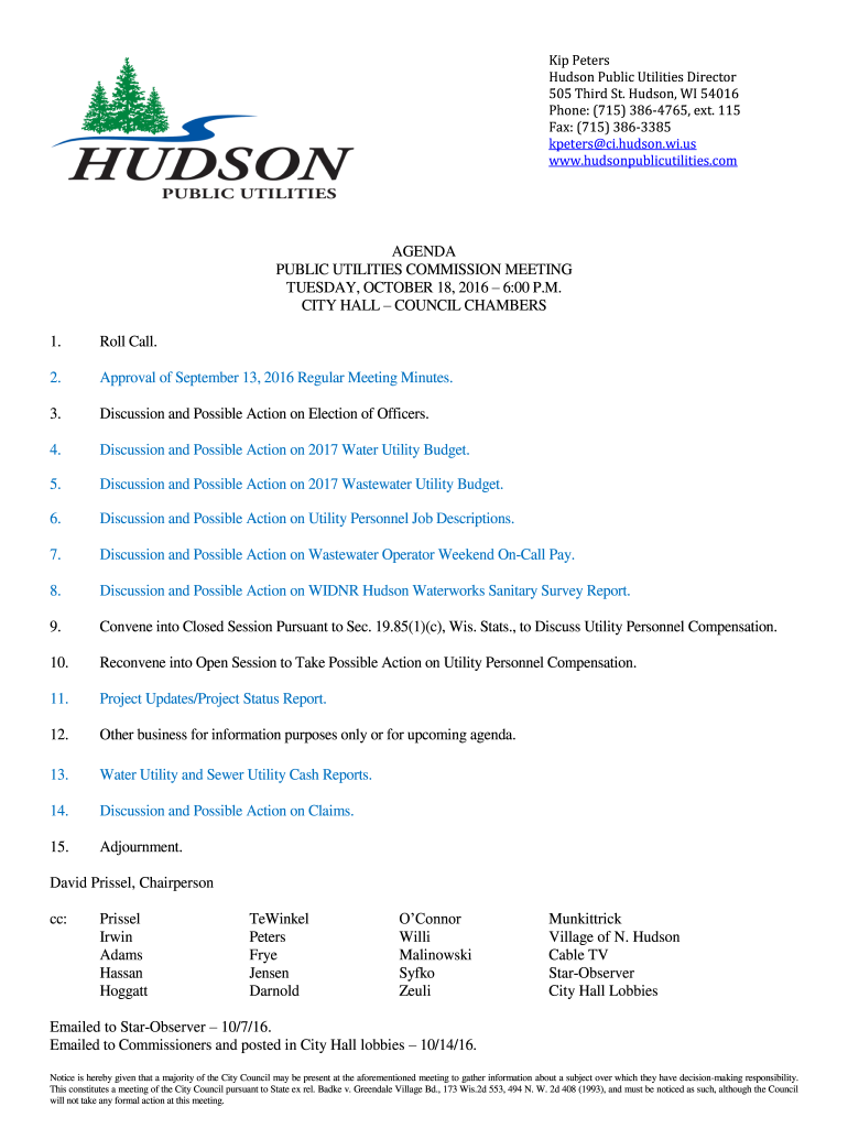 Kip Peters Hudson Public Utilities Director 505 Third St. Hudson, WI 54016 Phone: (715) 3864765, ext. 115 Fax: (715) 3863385 Peters CI. Hudson.WI.us www.hudsonpublicutilities.comAGENDA PUBLIC UTILITIES