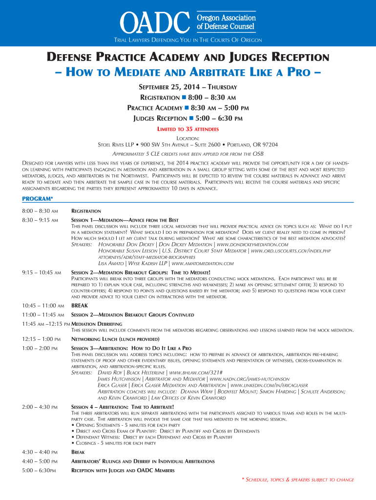 Trial Lawyers Defending Youth Courts Of OregonDefense Practice Academy and Judges Reception How to Mediate and Arbitrate Like a Pro September 25, 2014, Thursday Registration 8:00 8:30 am Practice