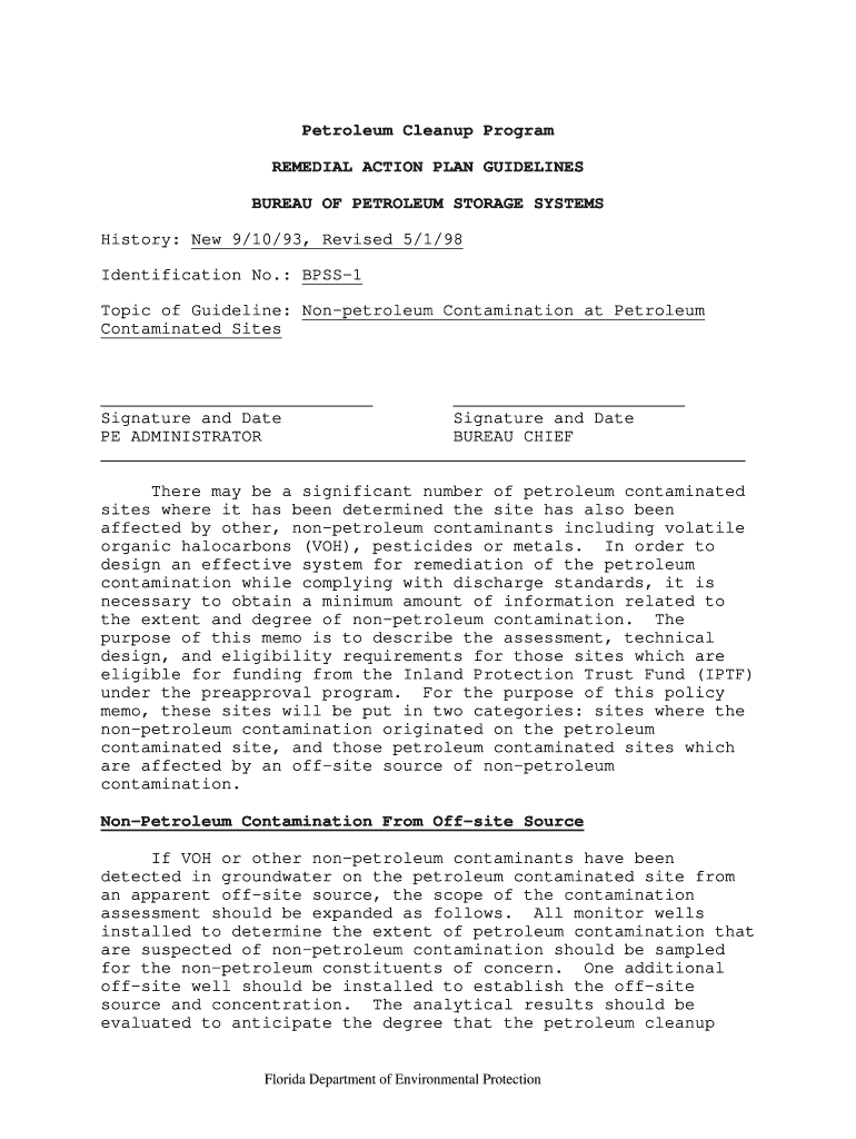 Petroleum Cleanup ProgramREMEDIAL ACTION PLAN GUIDELINESBUREAU OF PETROLEUM STORAGE SYSTEMSHistory: New 9/10/93, Revised 5/1/98Identification No.: BPSS1Topic of Guideline: Nonpetroleum Contamination