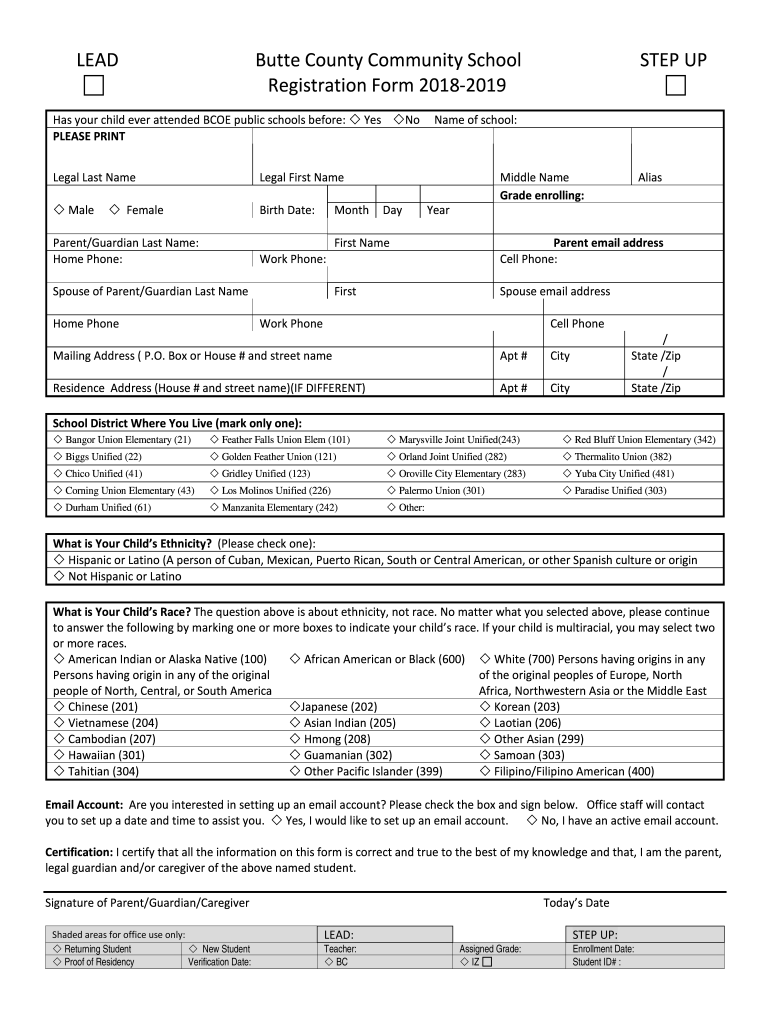 LEAD Butte County Community School Registration Form 20182019Has your child ever attended BCE public schools before: Yes No PLEASE PRINT Legal Last Nameless First Name Rebirth Date: FemaleParent/Guardian