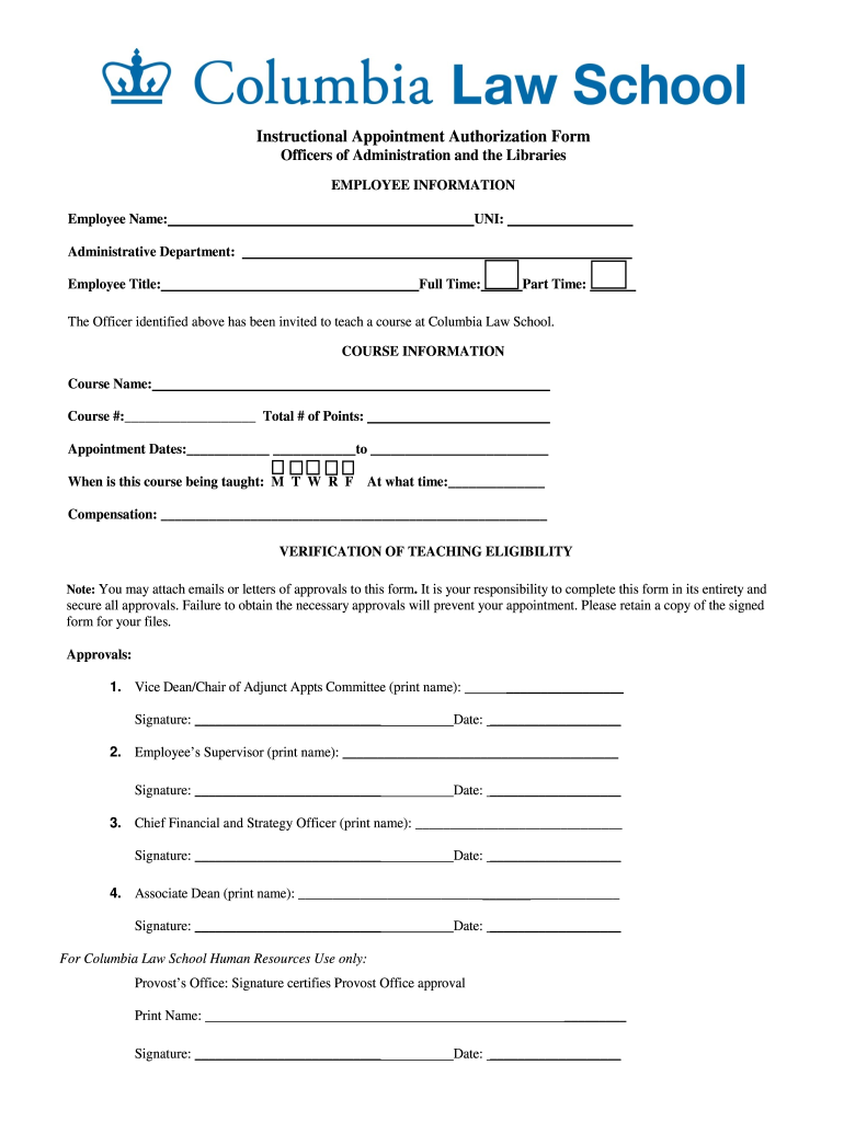 Instructional Appointment Authorization Form Officers of Administration and the Libraries EMPLOYEE INFORMATION Employee Name:UNI:Administrative Department: Employee Title:Full Time:Part Time:The Officer
