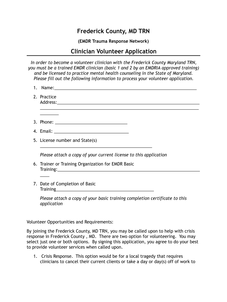 Frederick County, MD TEN (MDR Trauma Response Network)Clinician Volunteer Application In order to become a volunteer clinician with the Frederick County Maryland TEN, you must be a trained MDR clinician