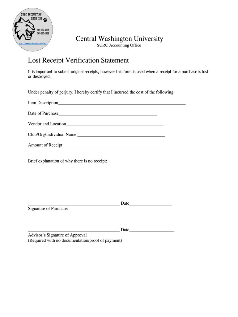 Central Washington University SURE Accounting Officers Receipt Verification Statement It is important to submit original receipts, however this form is used when a receipt for a purchase is lost or