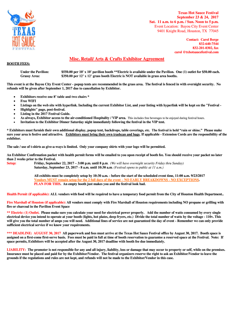 Texas Hot Sauce Festival September 23 & 24, 2017 Sat. 11 a.m. to 6 p.m. / Sun. Noon to 5 p.m. Event Location: Bayou City Event Center 9401 Knight Road, Houston, TX 77045 Contact: Carol Bore 8326407544