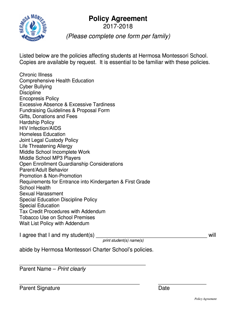 Policy Agreement 20172018 (Please complete one form per family) Listed below are the policies affecting students at Hermosa Montessori School. Copies are available by request. It is essential to be