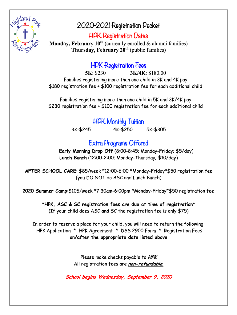 20202021 Registration Packet HP Registration Dates Monday, February 10th (currently enrolled & alumni families) Thursday, February 20th (public families)HP Registration Fees 5K: $2303K/4K: $180.00Families