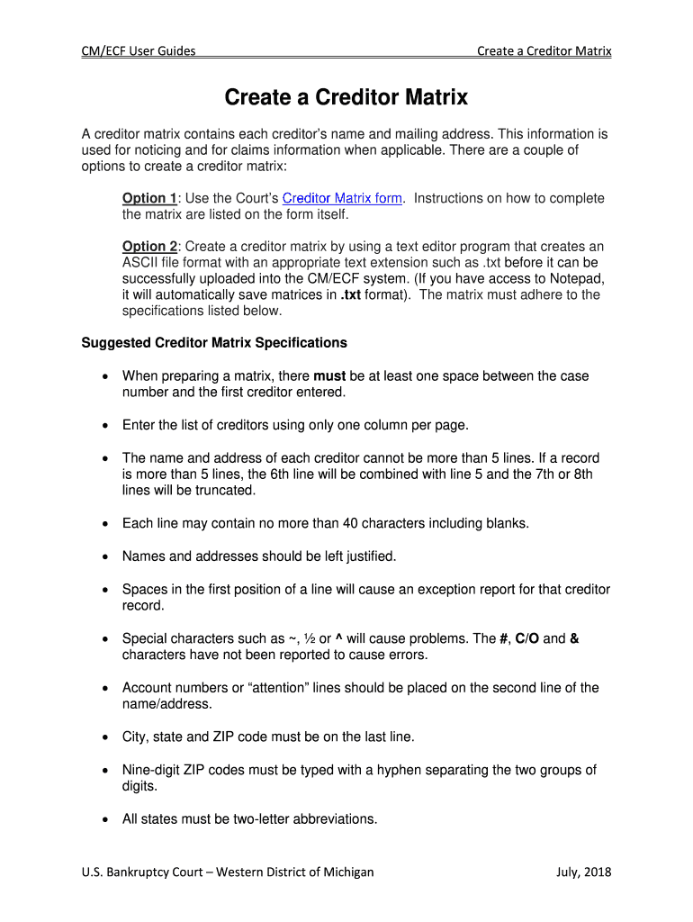 CM/ECF User GuidesCreate a Creditor Matriculate a Creditor Matrix A creditor matrix contains each creditor's name and mailing address. This information is used for noticing and for claims information