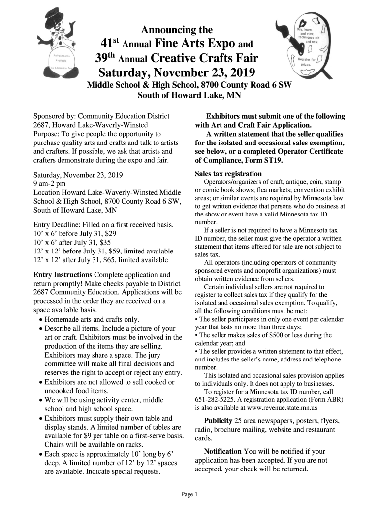 Announcing the41st Annual Fine Arts Expo and 39th Annual Creative Crafts Fair Saturday, November 23, 2019, Middle School & High School, 8700 County Road 6 SW South of Howard Lake, MN Sponsored by: