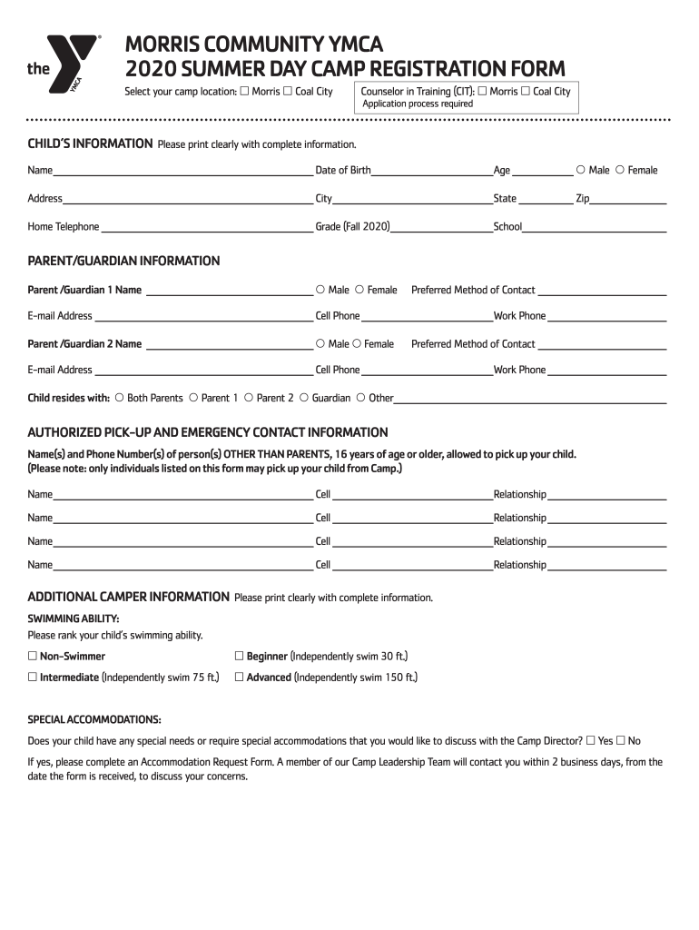 MORRIS COMMUNITY YMCA 2020 SUMMER DAY CAMP REGISTRATION FORM Select your camp location: Morris Coal CityCounselor in Training (CIT): Morris Coal City Application process requiredCHILDS INFORMATION