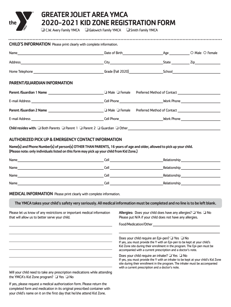 GREATER JOLIET AREA YMCA 20202021 KID ZONE REGISTRATION FORM C.W. Avery Family YMCAGalowich Family YMCA Smith Family YMCACHILDS INFORMATION Please print clearly with complete information. Name Date