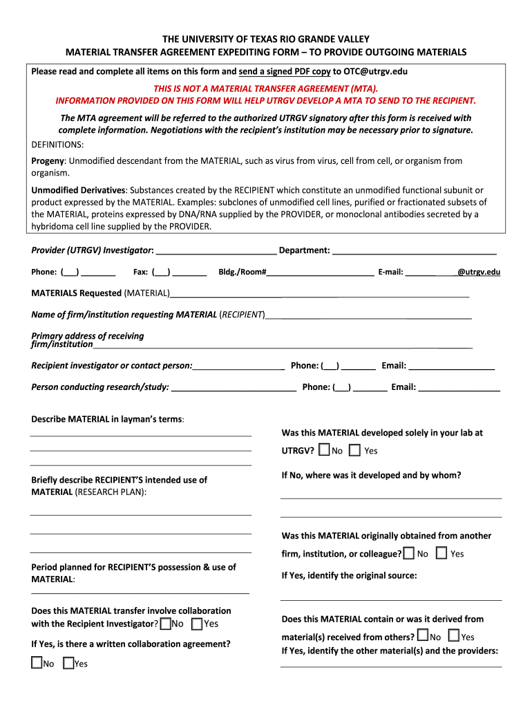 THE UNIVERSITY OF TEXAS RIO GRANDE VALLEY MATERIAL TRANSFER AGREEMENT EXPEDITING FORM TO PROVIDE OUTGOING MATERIALS Please read and complete all items on this form and send a signed PDF copy to OTC