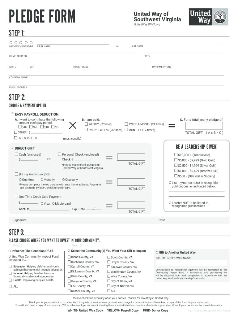 PLEDGE FORM STEP 1: MR/MRS/MS/MISS/DRMIFIRST NAMELESS NAMESAKE ADDRESSSTATECITYZIPDAYTIME PHONEME PHONECOMPANY NAMEEMAIL ADDRESSED 2: CHOOSE A PAYMENT OPTION EASY PAYROLL DEDUCTION B. I am paid:A.