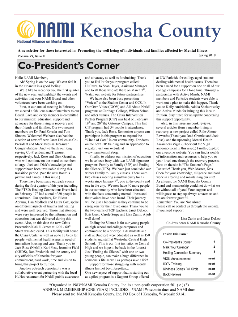 Co-Presidents Corner - NAMI is a section where the co-presidents of a National Alliance on Mental Illness (NAMI) chapter can share updates, information, and messages with members.
