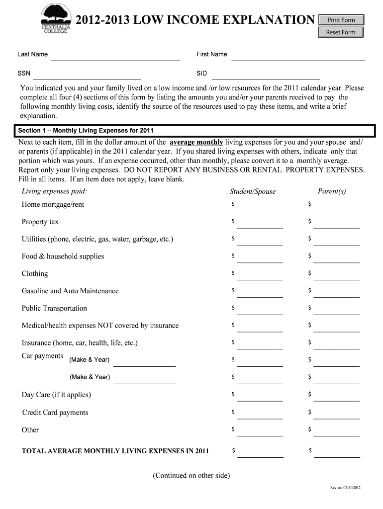 The Low Income Explanation Form is a financial aid application used by students and parents to document and explain low income and living expenses for the 2011 calendar year.