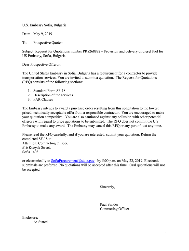U.S. Embassy Sofia, Bulgaria Date: May 9, 2019, To:Prospective QuotersSubject: Request for Quotations number PR8268882 Provision and delivery of diesel fuel for US Embassy, Sofia, Bulgaria Dear Prospective