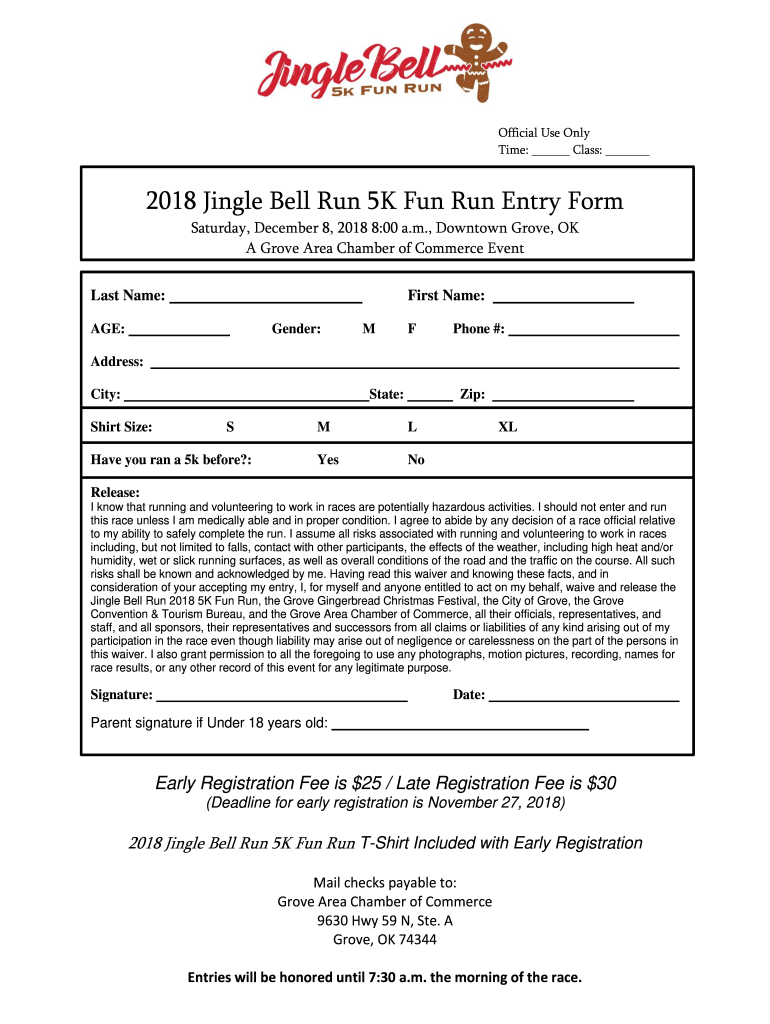 Official Use Only Time: Class: 2018 Jingle Bell Run 5K Fun Run Entry Form Saturday, December 8, 2018 8:00 a.m., Downtown Grove, OK A Grove Area Chamber of Commerce Event Last Name:First Name:AGE:Gender:MFP