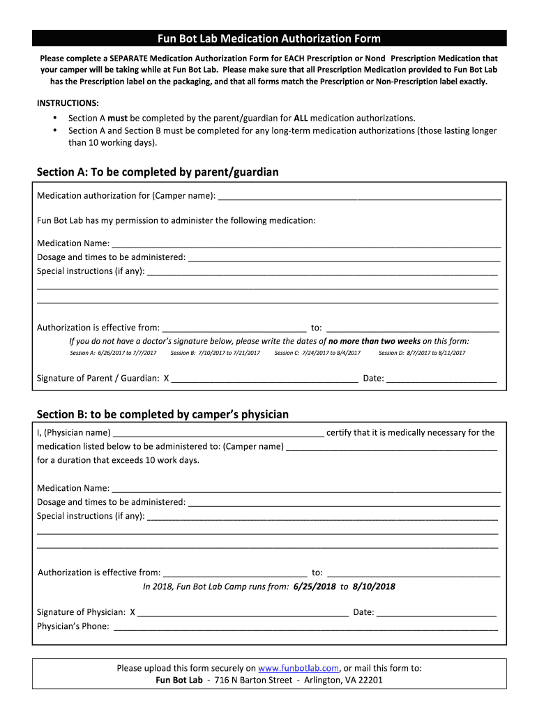 Fun!Bot! Lab! Medication! Authorization! Form, Please!complete!a!SEPARATE! Medication! Authorization! Form!for!EACH! Prescription!or! Non-Prescription! Medication!that! Your!camper!will!be!taking!while!at!