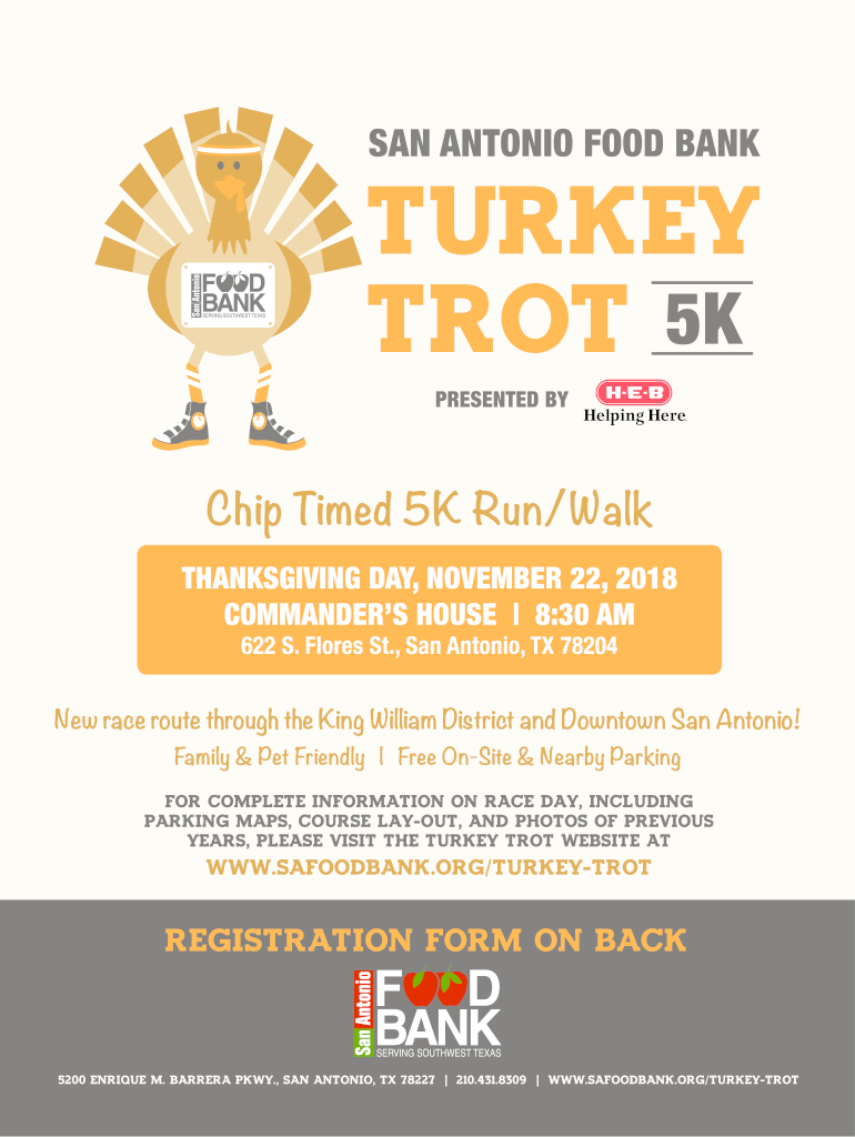 Chip Timed 5K Run/Walk2016 HEB, 166154THANKSGIVING DAY, NOVEMBER 22, 2018, COMMANDERS HOUSE 8:30 AM 622 S. Flores St., San Antonio, TX 78204New race route through the King William District and Downtown
