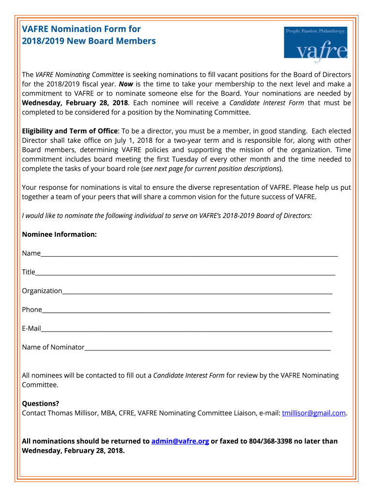 2018/2019 New Board Members ARE Nominating Committee is seeking nominations to fill vacant positions for the Board of Directors