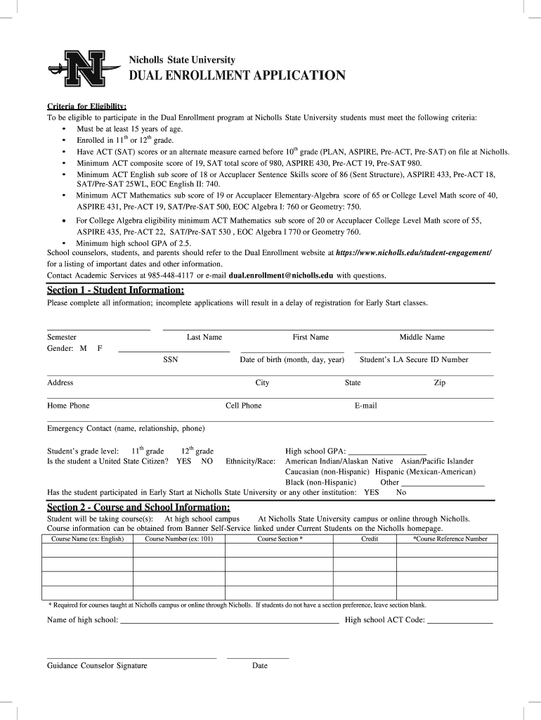 Nicholls State UniversityDUAL ENROLLMENT APPLICATION Criteria for Eligibility: To be eligible to participate in the Dual Enrollment program at Nicholls State University students must meet the following