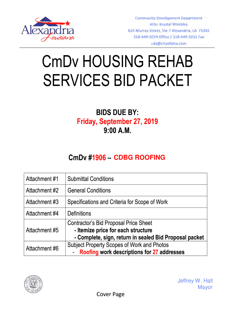 Community Development Department Attn: Rehab Program Manager 625 Murray Street, 3rd Floor, Alexandria, LA 71301 3184495074 Office / 3184495031 Fax CDA cityofalex.com CDV HOUSING REHAB SERVICES BID