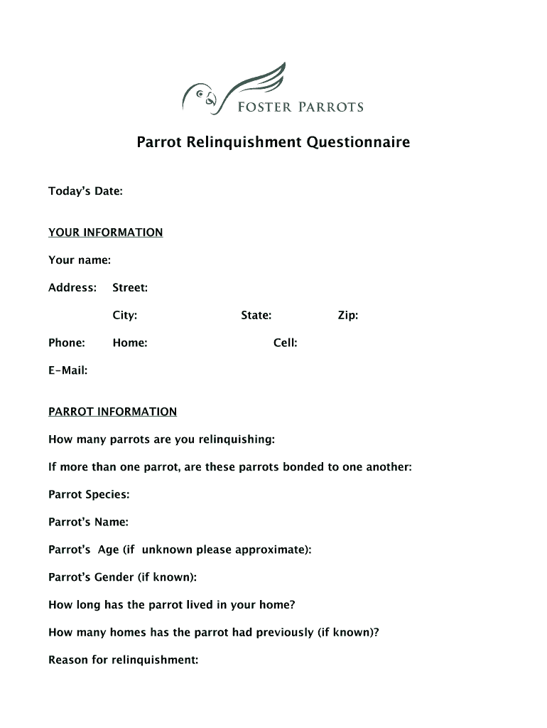 Any individual who is the legal owner of a parrot may complete the Parrot Relinquishment Questionnaire to provide information necessary for surrendering their pet.