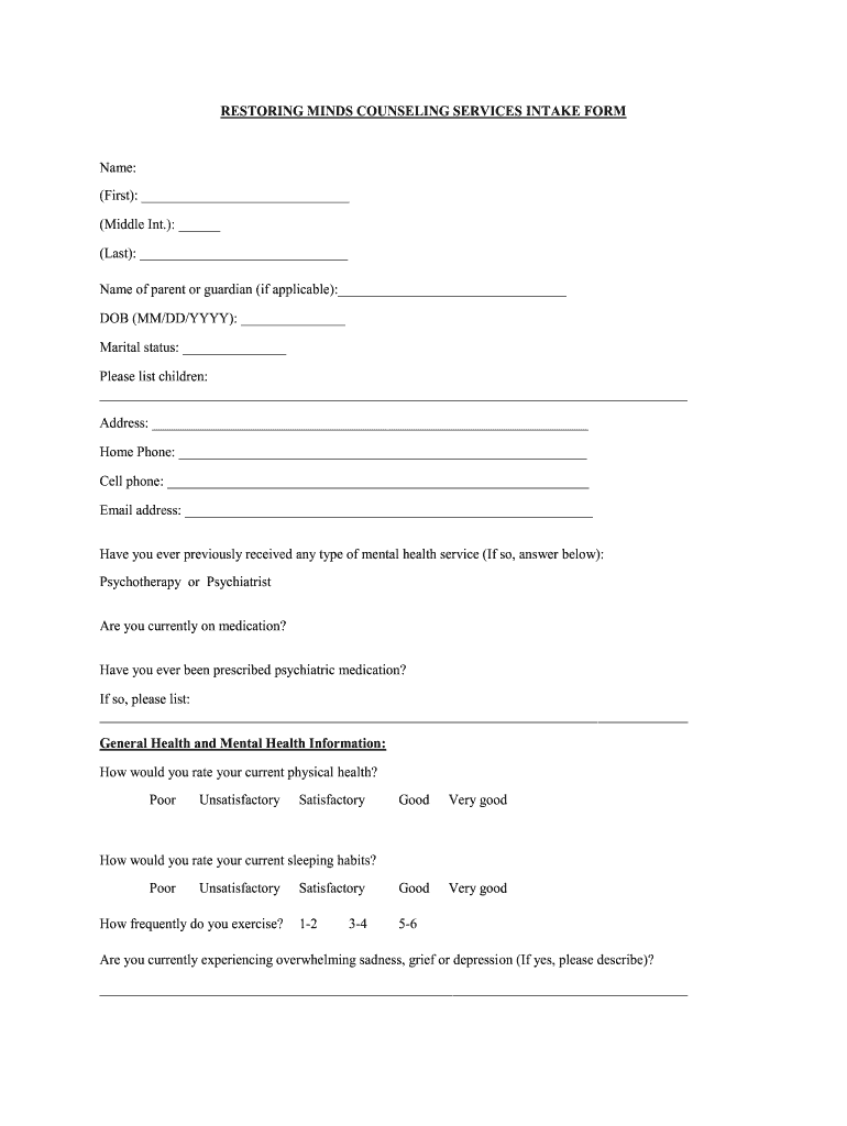Get the free RESTORING MINDS COUNSELING SERVICES INTAKE FORM