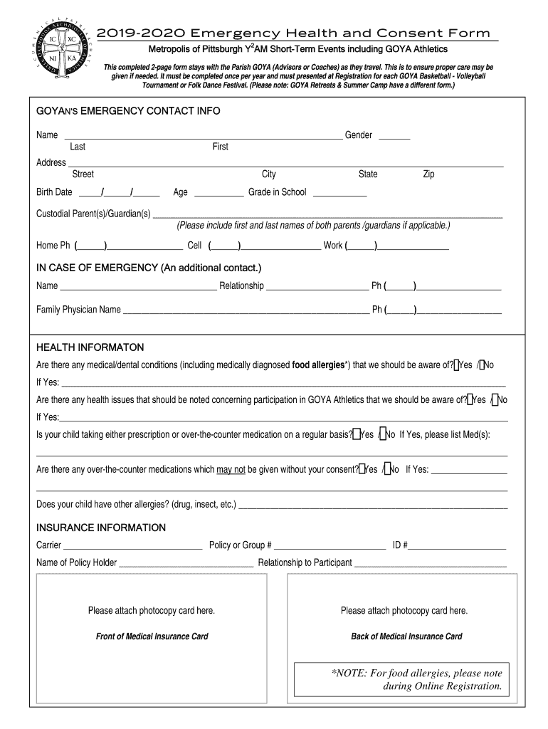 20192020 Emergency Health and Consent Form Metropolis of Pittsburgh Y2AM Shorter Events including GOYA Athletics This completed 2page form stays with the Parish GOYA (Advisors or Coaches) as they