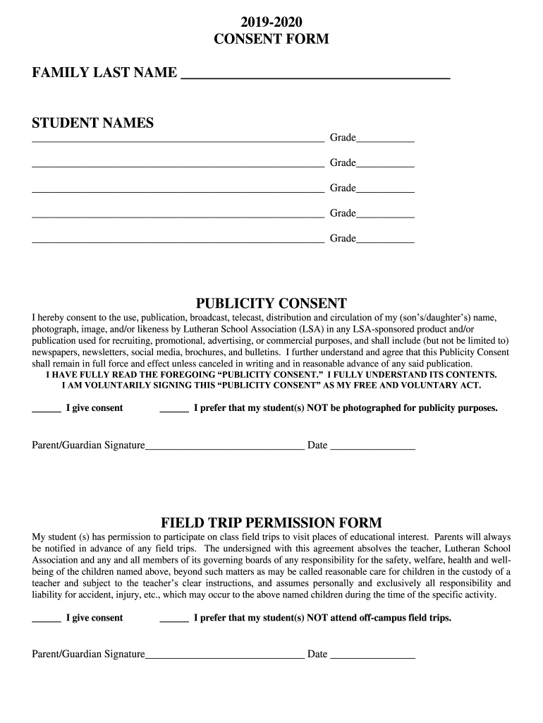 20192020 CONSENT FORM FAMILY LAST NAME STUDENT NAMES Grade Grade Grade PUBLICITY CONSENT I hereby consent to the use, publication, broadcast, telecast, distribution and circulation of my (sons/daughters)