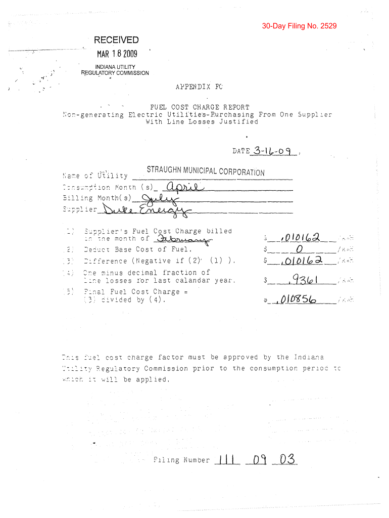 30Day Filing No. 2529RECEIVED “MAR 182009 INDIANA UTILITY REGULATORY COMMISSION “I, Al 'PEN DI X Fe:)FUEL COST CHARGE REPORT :: 'J!:Ger:eating Electric Utilities 'purchasing From One Suppl:.EI