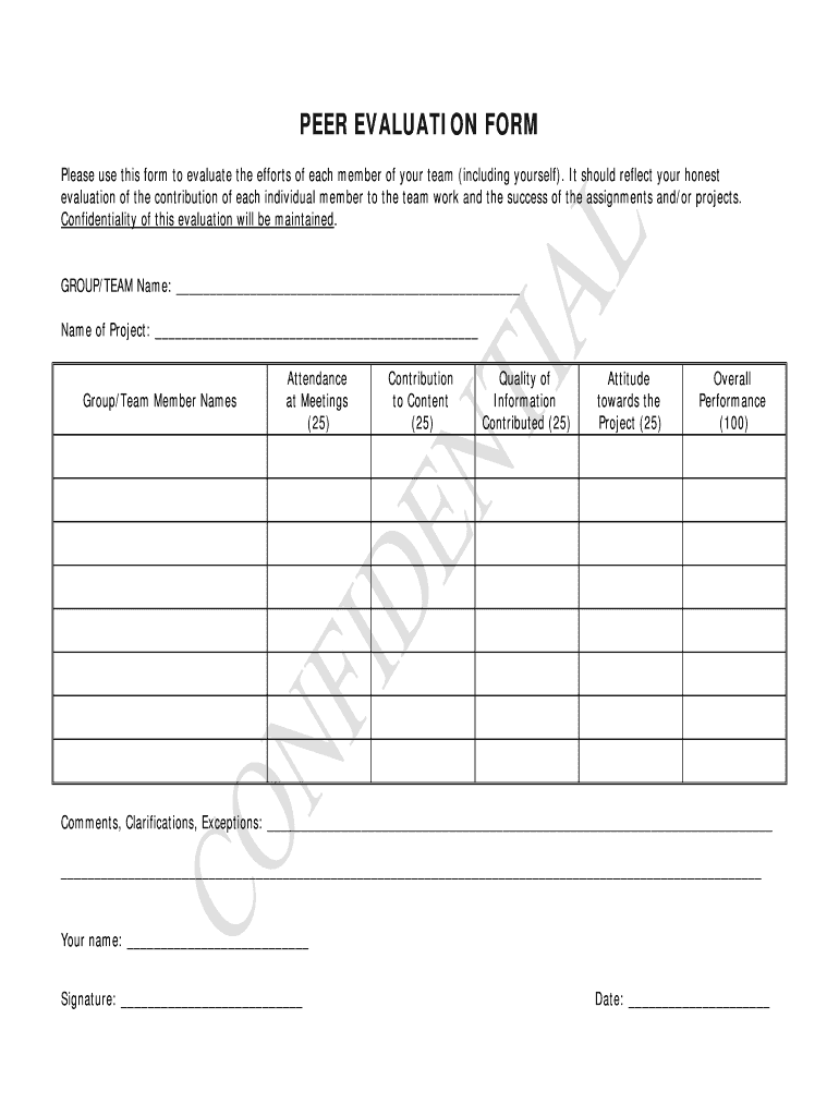 Typically, no additional documents are required with the Peer Evaluation Form. However, you might want to include any relevant project documentation if specifically requested.