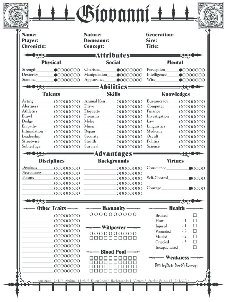 Giovanni Name: Player: Chronicle:Nature: Demeanor: Concept:Generation: Sire: Title:Attributes PhysicalSocialMentalStrength OOOOOOOO Dexterity OOOOOOOO Stamina OOOOOOOOCharisma OOOOOOOO Manipulation