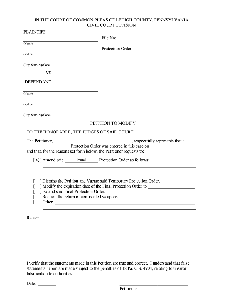 IN THE COURT OF COMMON PLEAS OF LEHIGH COUNTY, PENNSYLVANIA CIVIL COURT DIVISION PLAINTIFF File No: (Name)Protection Order(address) (City, State, Zip Code)VS DEFENDANT (Name) (address) (City, State,