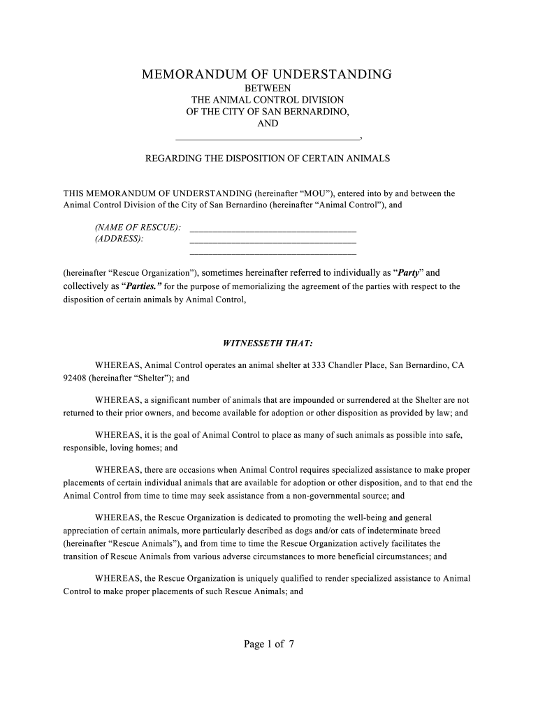 MEMORANDUM OF UNDERSTANDING BETWEEN THE ANIMAL CONTROL DIVISION OF THE CITY OF SAN BERNARDINO, AND, REGARDING THE DISPOSITION OF CERTAIN ANIMALISTIC MEMORANDUM OF UNDERSTANDING (hereinafter YOU),