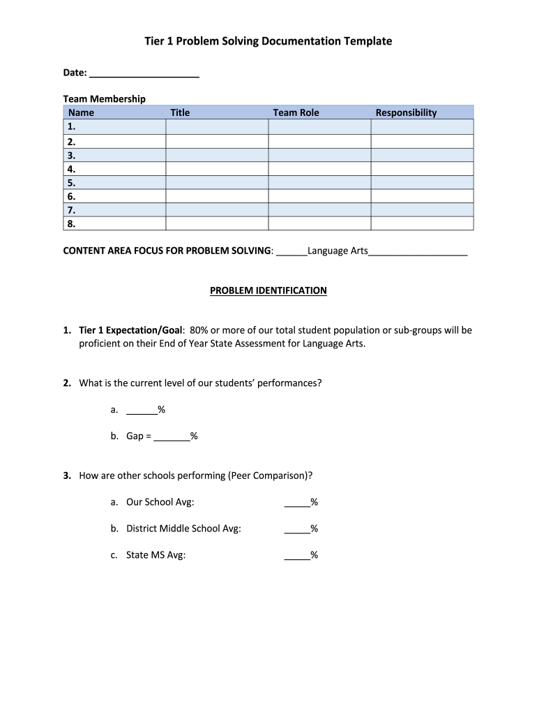 Tier%1%Problem%Solving%Documentation%Template% ! Date:% % % % % Team%Membership% Name Title Team%Role% Responsibility 1.! % ! ! ! 2.! % ! ! ! 3.! % ! ! ! 4.! % ! ! ! 5.! % ! ! ! 6.! % ! ! ! 7.! %