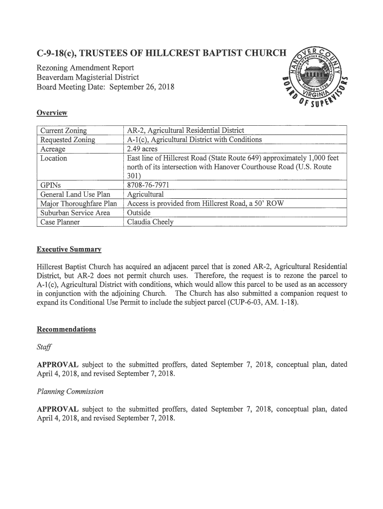 C918(c), TRUSTEES OF HILLCREST BAPTIST Church, Rezoning Amendment Report