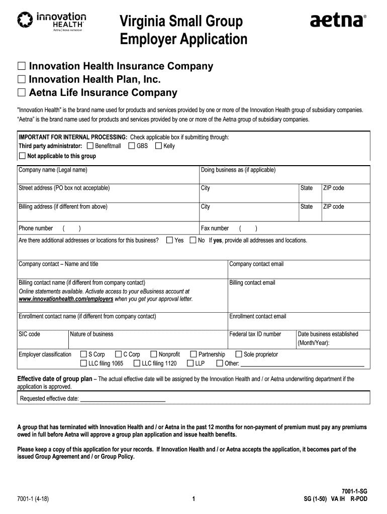 Virginia Small Group Employer Application Innovation Health Insurance Company Innovation Health Plan, Inc. Aetna Life Insurance Company “Innovation Health is the brand name used for products and
