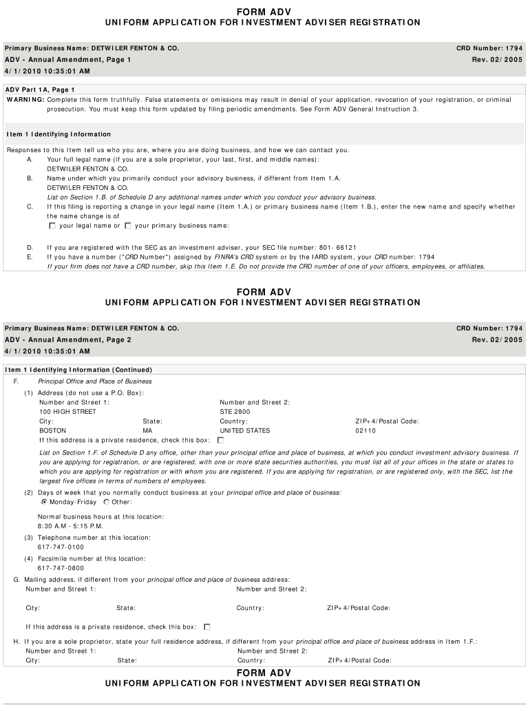 FORM ADV UNIFORM APPLICATION FOR INVESTMENT ADVISER REGISTRATION Primary Business Name: DETAILER BENTON & CO.CRD Number: 1794ADV Annual Amendment, Page 1Rev. 02/20054/1/2010 10:35:01 AM ADV Part 1A,