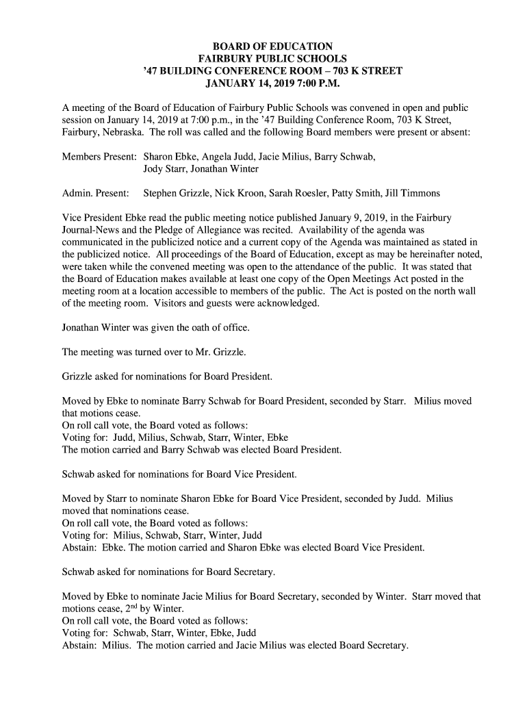 BOARD OF EDUCATION MARBURY PUBLIC SCHOOLS 47 BUILDING CONFERENCE ROOM 703 K STREET JANUARY 14, 2019 7:00 P.M. A meeting of the Board of Education of Fair bury Public Schools was convened in open and