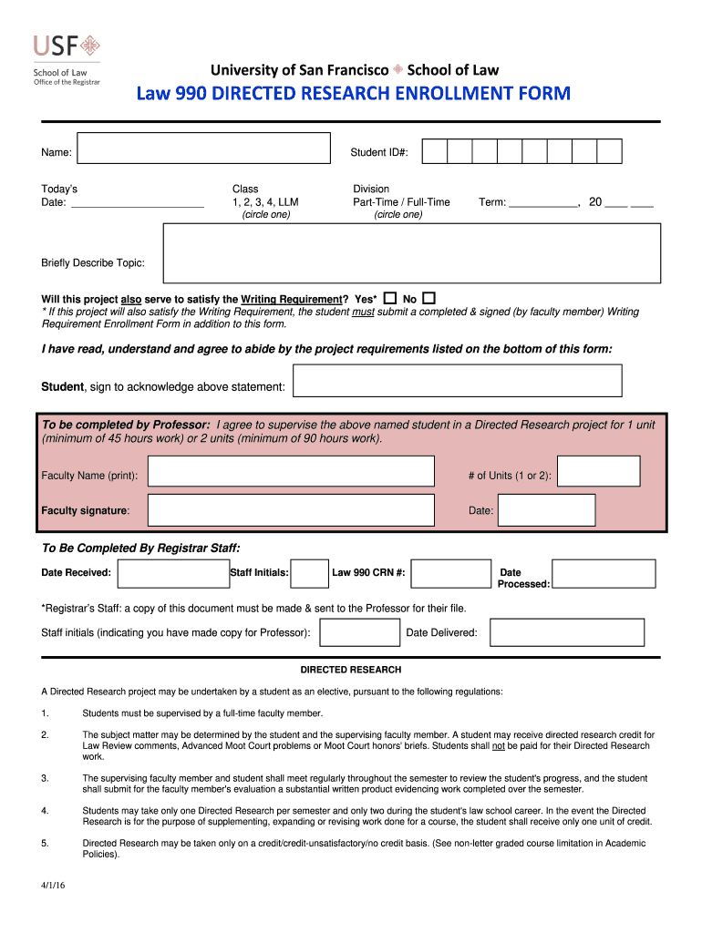 UniversityofSanFrancisco SchoolofLaw Law990DIRECTEDRESEARCHENROLLMENTFORMName:Student ID#:Today's Date: Class 1, 2, 3, 4, Elmdale:Division Maritime / Halftime(circle one)Term:, 20 (circle one)Briefly
